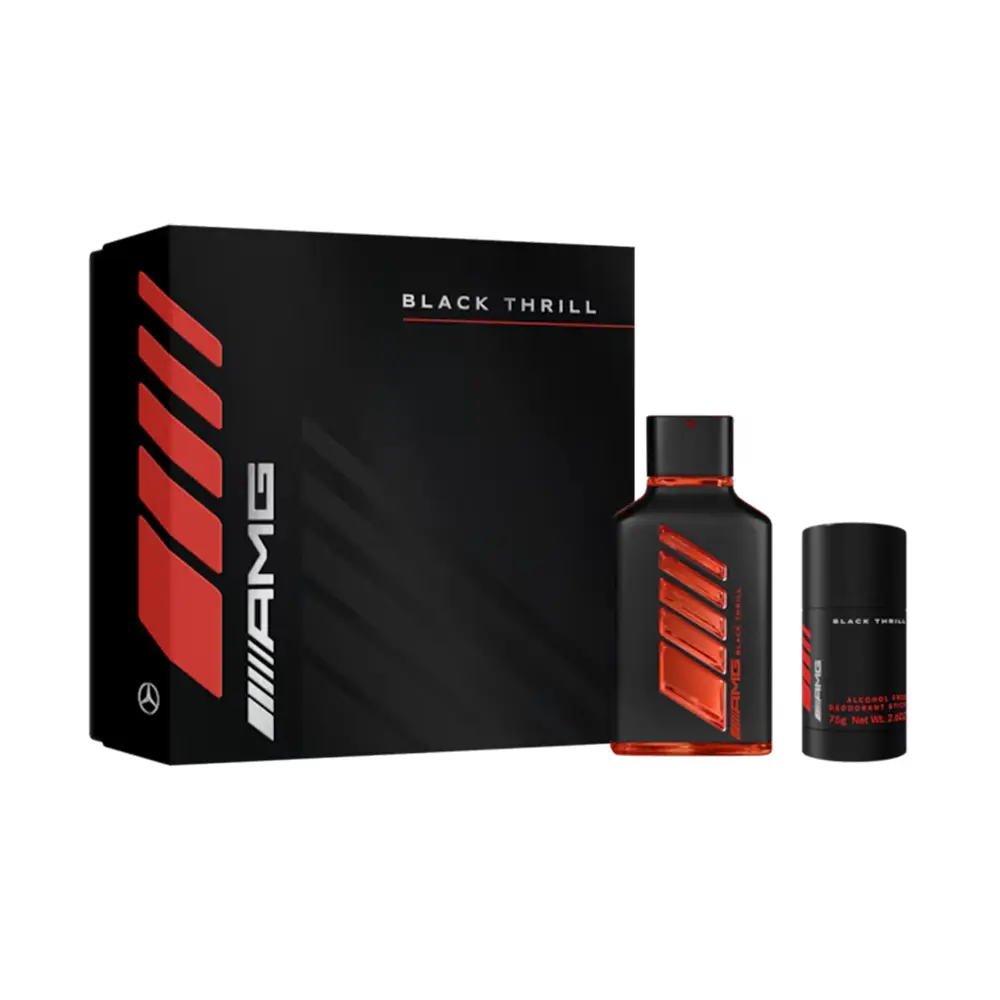 Luxus, Kraft, Freiheit – das AMG Black Thrill Geschenkset. Dieses exklusive Set kombiniert das markante Eau de Parfum mit einem passenden Deostick für ein unverwechselbares, langanhaltendes Dufterlebnis. BLACK THRILL vereint süchtig machende Tonkabohne und Leder mit dem aromatischen Charakter von Muskatellersalbei und der fruchtigen Frische reifer Mandarinen – eine betörende Komposition, die maskuline Eleganz und Dynamik verkörpert. Die nachfüllbare Flasche aus Glas und Aluminium mit pulsierendem Herzdesign ist eine stilvolle Hommage an AMG.